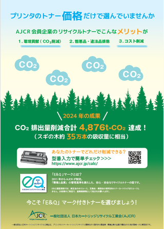 一般社団法人日本カートリッジリサイクル工業会は、プリンタのトナーカートリッジリサイクル事業を行う国内外の製造業・関連企業の会員で構成された我が国唯一の工業団体です。環境に配慮した高品質なリサイクルトナーカートリッジを供給できるよう、次の 3 つの方針に基づき活動しています。